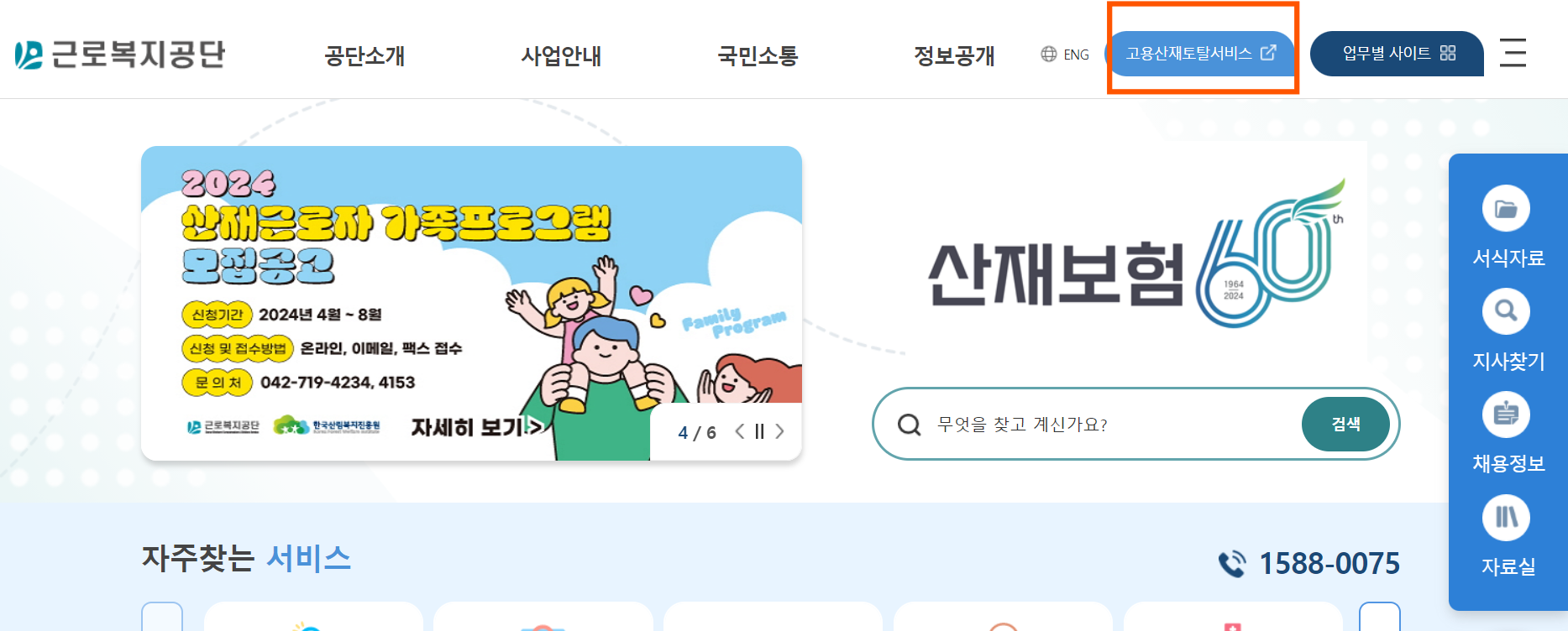 우선, 근로복지공단 홈페이지에 접속합니다. 그리고 오른쪽 상단에 보이는 [고용산재 토탈서비스]를 클릭하세요.